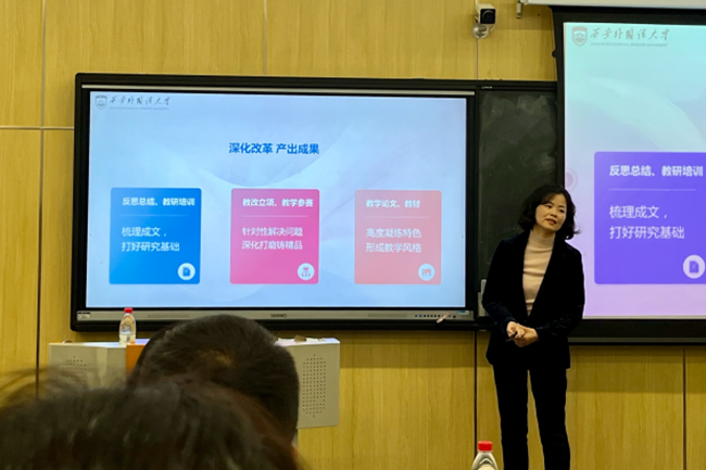 讲座中,徐莉教授围绕国家需求、教学反思、优化基本功、改革创新等四个方面,分析了国家对外语人才的需求以及应该培养什么样的外语人才,并与老师们共同探讨了外语教学中面临的问题及解决方法。徐莉教授以其主讲的《实践俄语》为例,分享了如何进行教学反思,如何编写课程大纲、教案及教学设计,以及课堂怎样采取多种方式提升学生的外语综合能力等。徐莉教授鼓励老师们,要坚持深化改革,不断产出成果,在专业上勤耕不辍,才能滴水石穿。在互动环节,徐莉教授还耐心解答了老师们提出的问题,并分享自己在俄语教学方面的经验和思考。