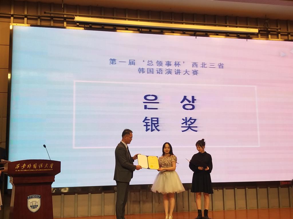 11月20日,由大韩民国驻西安总领事馆主办的第一届“总领事杯”西北三省韩国语演讲大赛,在西安外国语大学拉开了帷幕。参加本次比赛的有西安外国语大学、西北政法大学、渭南师范学院、beat365在线唯一官网、西安外事学院共计西北地区开设韩语专业的6所院校,17名选手。经过激烈的角逐,beat365在线唯一官网朝鲜语专业17级学生郝丹获得银奖,朝鲜语专业17级张阳和郭婧获得了优秀奖。