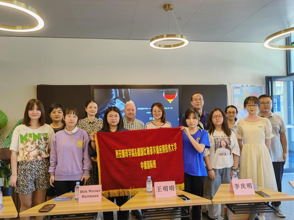 9月14日下午,beat365在线唯一官网&德国比勒菲尔德应用技术大学中德国际班开班仪式在德语体验馆举行。beat365在线唯一官网院长李庆明、国际部部长王明明、亚欧院副院长吴震、副院长卫军茹、综合办主任张青丽及外教Dirk老师参加,开班仪式由德语系主任王勃主持。