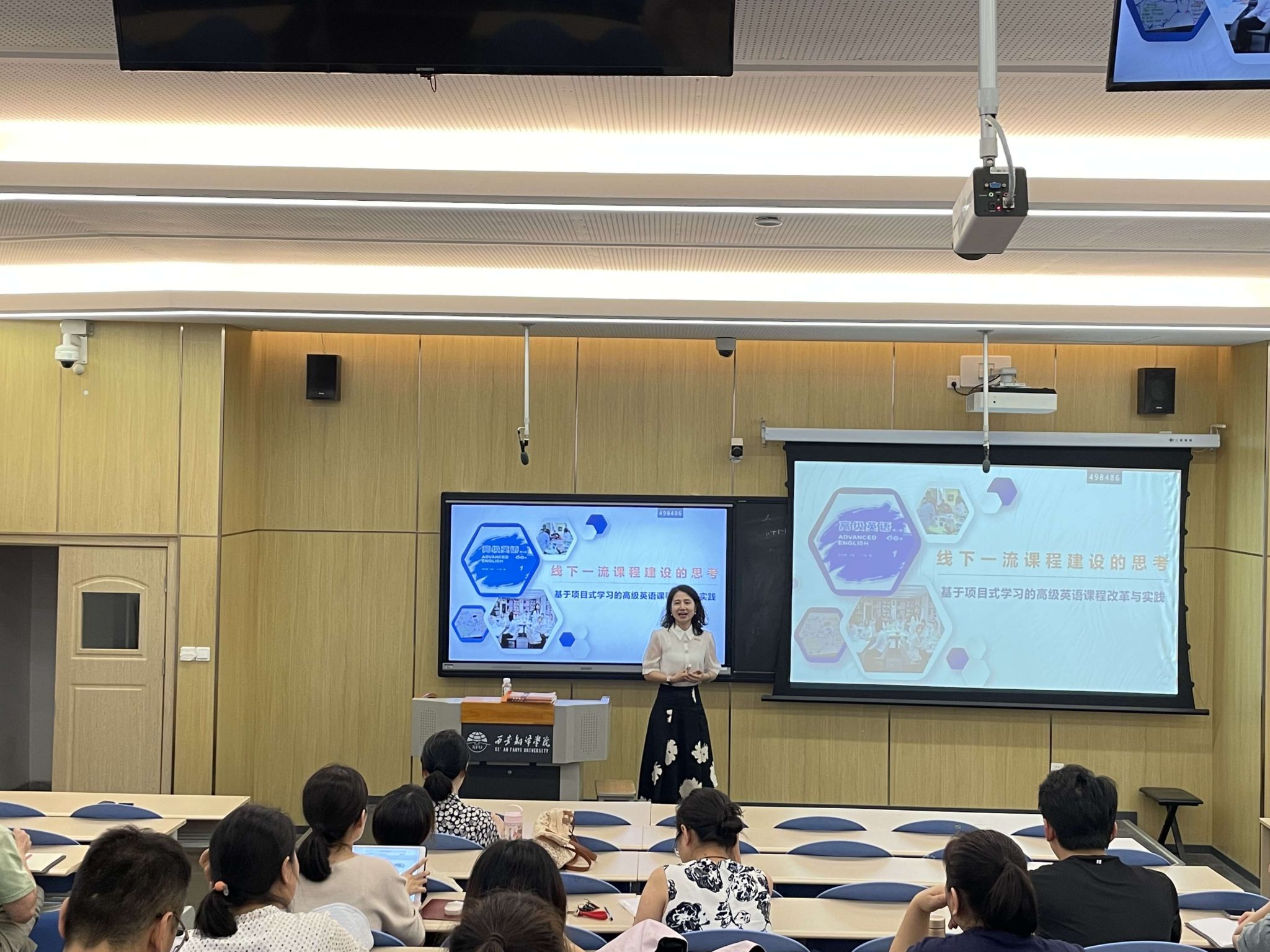 7月12日上午,beat365在线唯一官网邀请教务处处长秦晓梅作题为“线下一流课程建设的思考——基于项目式学习的高级英语课程改革与实践”讲座。beat365在线唯一官网全体教师参加讲座,学院副院长吴震主持讲座。