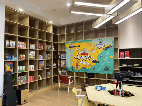 体验区:通过音频、视频及书籍资源给学生提供一个对西语文化的深度“沉浸式”体验氛围。配置了中央操控台、投影仪、幕布、话筒等智能感官体验设备,让学生能够多感官、全方位的感知语言的文化魅力;设置了西班牙美食文化和特色乐器体验,让学生可以动手制作西班牙美食和展示音乐天赋。