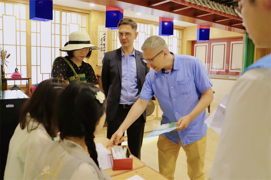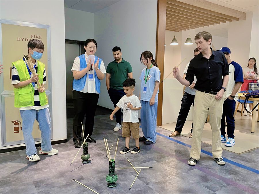 在外国语言与文化实践教学中心的中华文化体验馆、法国文化体验馆、西班牙文化体验馆、日本文化体验馆、韩国文化体验馆等,安排了汉服穿着体验、茶文化体验、书法临摹、投壶、剪窗花、中国传统文化知识问答等系列活动,吸引了众多外国专家及亲属的踊跃参与;同时,在西区小剧场还安排了包粽子体验及品赏粽子、绿豆糕、雄黄酒等端午节特色玉食琼酿,旨在让嘉宾们充分感受和了解中国端午礼俗及文化。