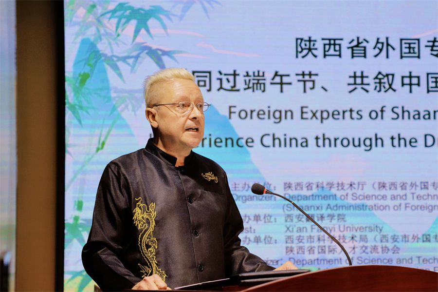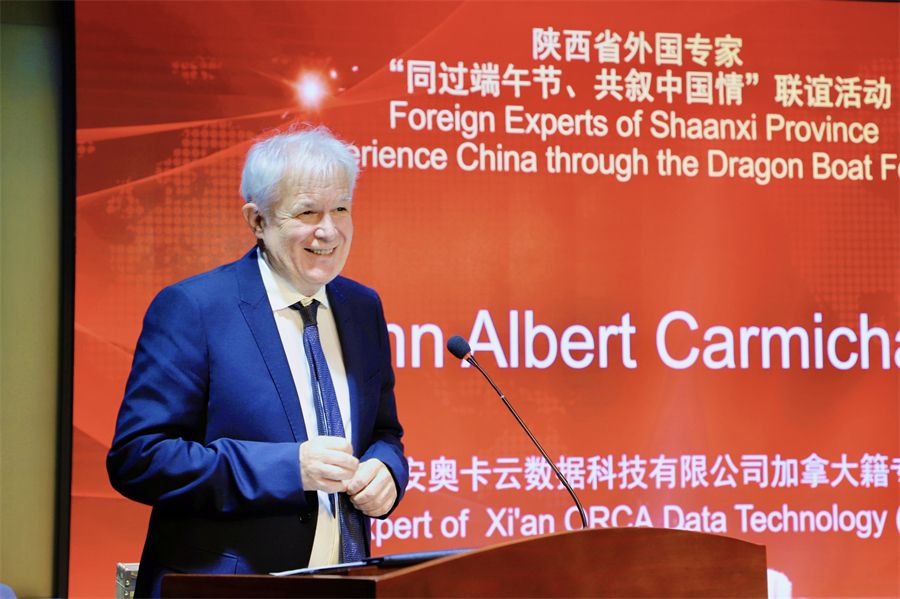 西安奥卡云数据科技有限公司加拿大籍专家John Albert Carmichael代表外国专家发言。他表示,端午节是个重要的节日,作为中加跨国家庭,他欣然接受西方及中国文化。他讲述了自己与家人对中国书法、戏曲以及艺术品的热爱,回顾总结了自己来西安工作、创业五年来的所感所获,并讲述了公司未来与中国科创发展同向同行的规划部署。他强调了不同文化间沟通交流的重要性,并阐释了企业与政府机构、大学之间关于技术、科研等方面合作的必要性。他表示,回眸过往,感受当下,值得庆贺的是西安科技发展日新月异,公司事业发展亦颇有建树,长路绵延,未来共赴。