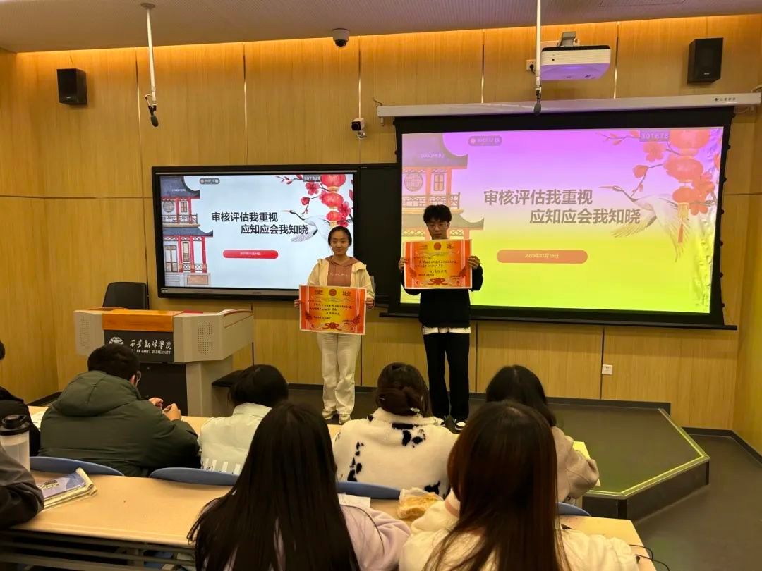 本次本科教育教学审核评估应知应会知识竞赛采取现场竞答形式。参赛题型分为选择题和简答题。以个人为单位进行,累积分数前五名获得优秀个人奖,班级累计分数前二获得优秀组织奖。