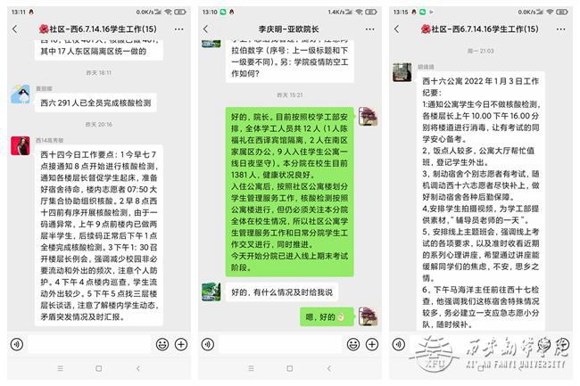 学院学工人员全情投入到疫情防控的学生管理与服务中。在校学工部的统一指导下,学院学工人员全体入住公寓,并已逐步完善了公寓管理服务的“社区化”模式。在公寓中心管理员和辅导员互相配合、携手并进下,公寓学生管理工作已全面铺开,步入正轨,各项工作有条不紊地推进着。疫情防控和学生公寓日常管理工作同步推进,为学生在公寓架起了随时对接管理和服务的沟通桥梁,积极解决学生们的各种困难和需求,为社区1655名学生提供了有效的服务保障。在日常管理过程中,辅导员对学生的思想引领和情绪疏导工作也非常到位。他们及时召开线上主题班会、积极引导学生参与各类学习与讨论、每天进行身体锻炼等有益于学生健康的各项活动。