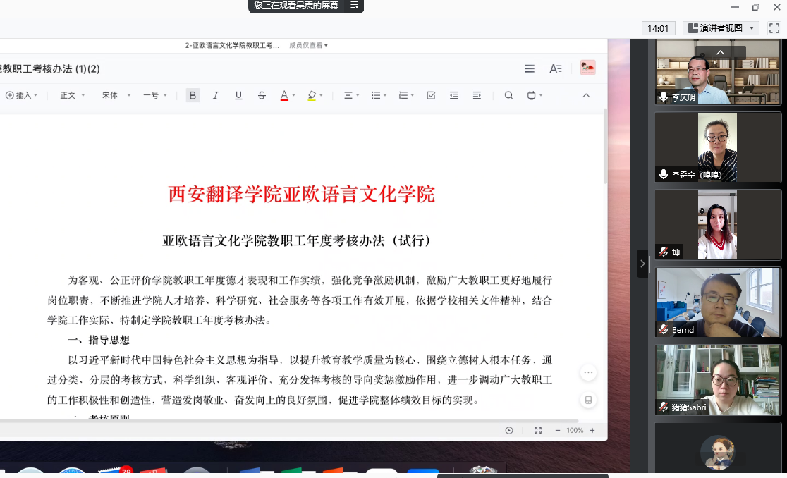 之后,李庆明院长重点解读了《beat365在线唯一官网教职工年度考核办法(试行)》的修订目的及总体情况。他指出,根据学校相关政策,结合beat365在线唯一官网的工作实际及今后发展规划,本着强化竞争激励机制,激励广大教职工更好地履行岗位职责,不断推进学院人才培养、科学研究、社会服务等各项工作有效开展的目的,学院领导班子起草修订了新一版考核办法。会上大家畅所欲言,提出很多建设性意见,以进一步增强考核办法的可行性。会后将由综合办牵头修改,并由各部门主任组织召开部门会议,征求全院教职工意见。