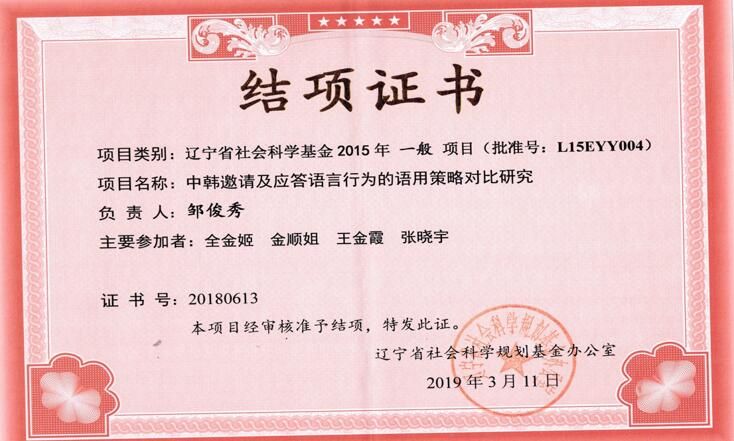 朝鲜语专业学生参加各种专业资格证考试,其中韩国教育部举办的韩国语能力考试中高级过级率达80%以上,参加教育部承办的朝鲜语专业四级考试过级率达90%以上。另外,2019级周亦可、张珂辉、潘柳婷在第三届“总领事杯”西北三省韩国语演讲大赛中获得铜奖;2019级陈静在第十四届山东省大学生科技节科技翻译大赛中二等奖;2018级王佳音在第二届中韩大学生演讲比赛中获得陕西赛区第二名,在第二届“总领事杯”西北三省韩国语演讲大赛中获得银奖;2018级段曌在第二届“总领事杯”西北三省韩国语演讲大赛中获得铜奖;2017级郝丹在第一届“总领事杯”西北三省韩国语演讲大赛中获得银奖。