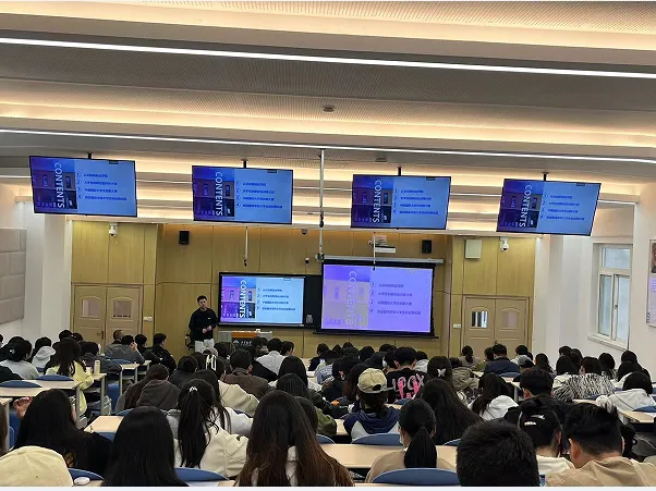 李江涛首先通过短视频的方式对创新创业学院进行了介绍。随后,他从中国国际大学生创新大赛介绍、校赛流程、师生奖励政策三个方面对中国国际大学生创新大赛进行了解读。