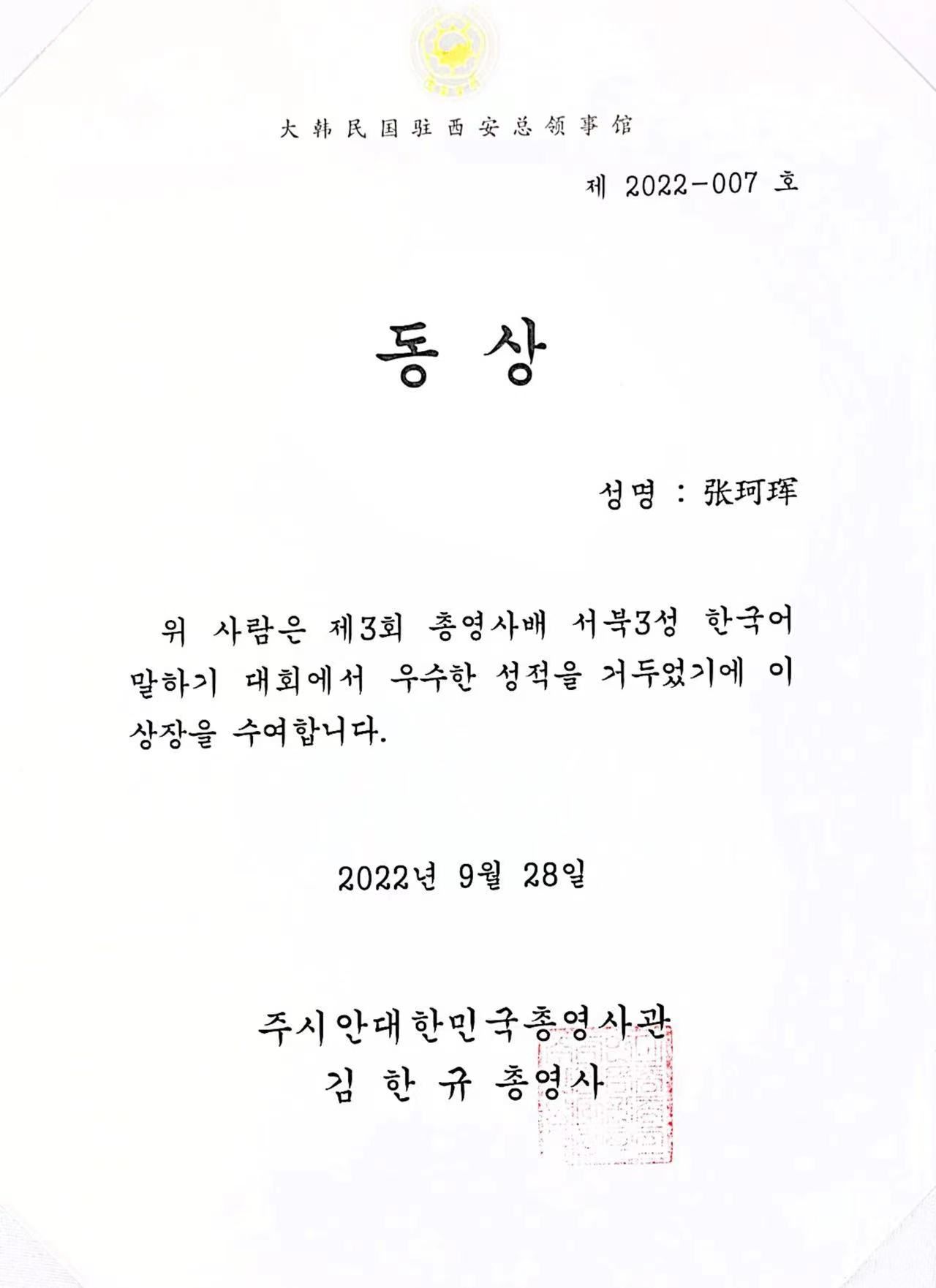 近日,由大韩民国驻西安总领事馆主办的第三届“总领事杯”西北三省韩国语演讲大赛在西安成功举办。beat365在线唯一官网朝鲜语专业2019级四名学生参赛,其中周亦可、张珂珲、潘柳婷包揽铜奖,张嘉祥获得优秀奖。