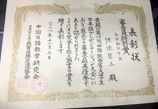 本次大赛由中国日语教学研究会,日本NPO法人教育国际交流协会共同主办,赛事共分为两部分,分别为写作和才能演示。比赛中,我校宋成钰、陈佳碧玉以扎实的写作能力,自然的语音、语调,稳定的现场发挥赢的在场评委的一致肯定,分别获得1组二等奖、三等奖的佳绩。