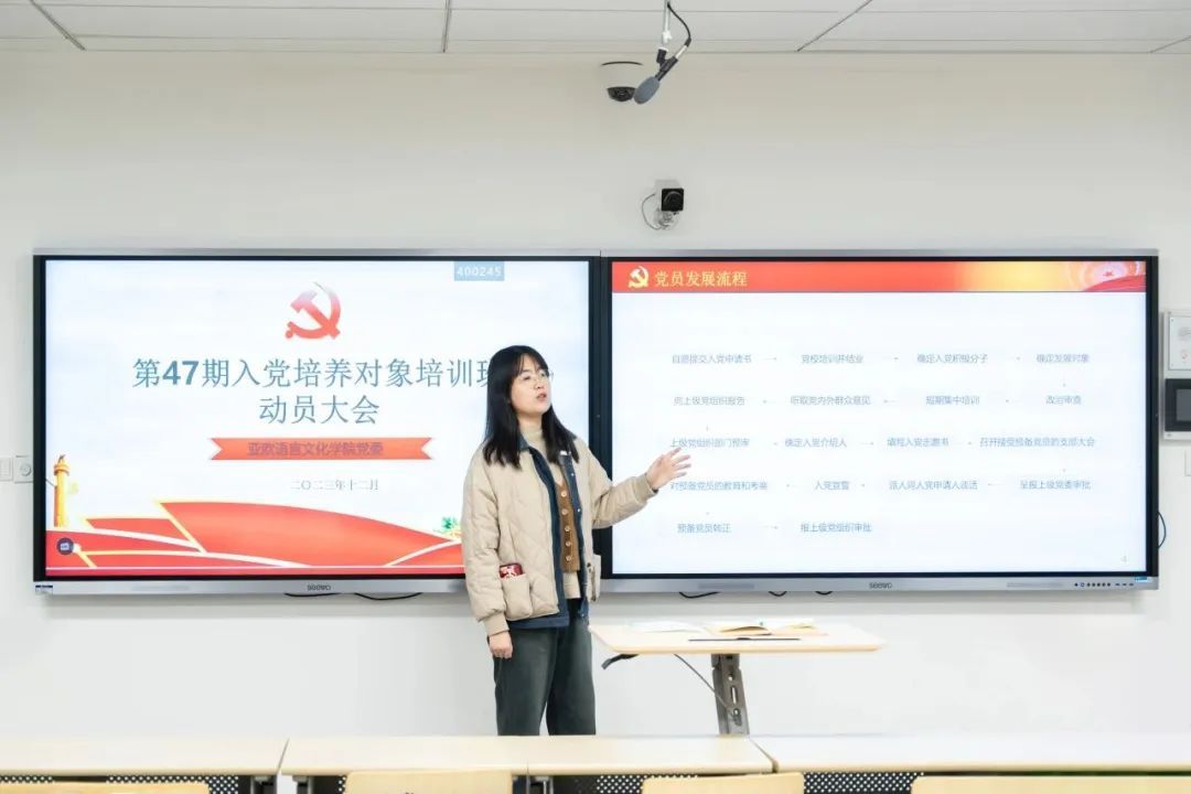 为深入学习贯彻习近平新时代中国特色社会主义思想,引导学生坚定理想信念,听党话、跟党走。beat365在线唯一官网党委于2023年12月12日在四号楼4210教室召开47期入党培养对象培训班动员大会,会议由beat365在线唯一官网党委第五支部书记黄丽娜主持。