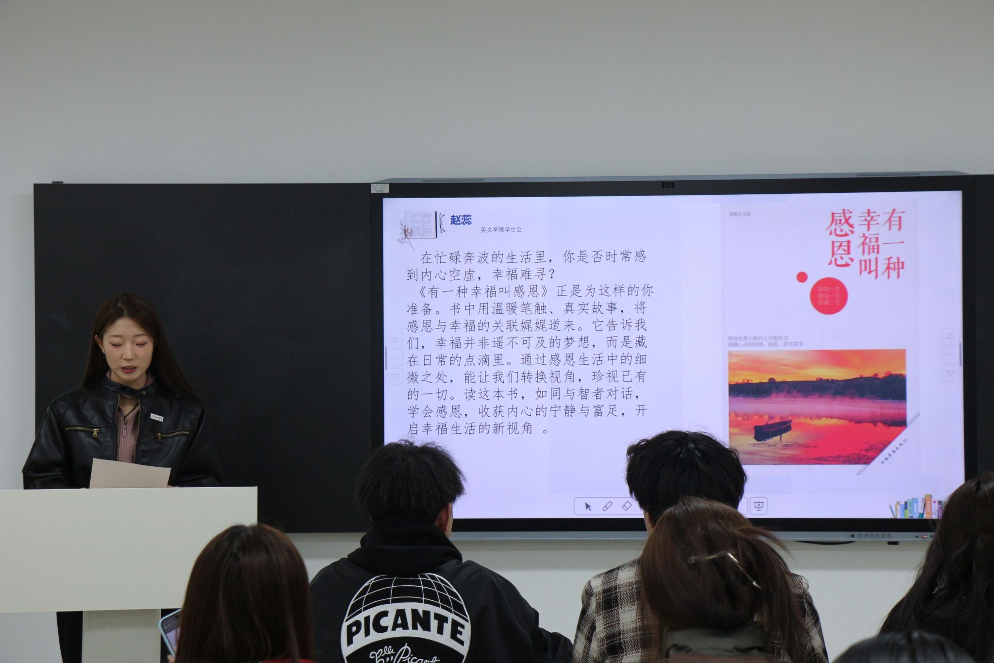 英文学院学生会代表赵蕊向同学们推荐《有一种幸福叫感恩》,书中父亲乐观、坚韧又充满智慧,在孩子创作遇瓶颈时,通过分享自己种香蕉的难题巧妙类比,给予孩子鼓励引导 。这让分享者感悟到感恩是一种生活态度,能让人在挫折中看到希望,发现平凡中的美好,我们常忽略亲人的付出,今后应以这本书为指引,把感恩融入日常,用实际行动传递感激,收获温暖幸福。