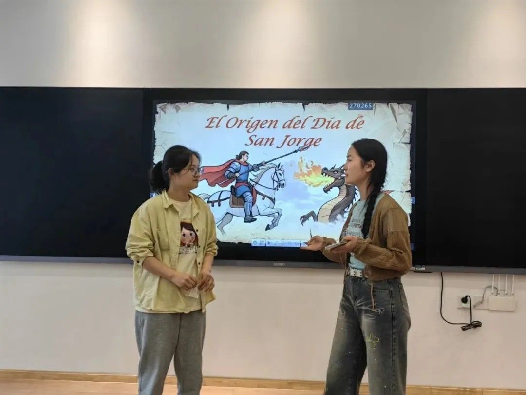 第五组由24级庞宇惠、罗舒月、刘雪静、崔浅予、时惠民、李秋月、叶家仪、王铭浩、张勇豪带来,故事起源于加泰罗尼亚地区的一个传说。相传在TARRAGONA的MONTBLANC小镇有一条恶龙,恶龙口吐毒气,杀人无数。城内居民无比恐惧,决定每日随机抽一居民献祭给恶龙。某天,公主被抽中,当她走向巨龙时,骑士乔治骑着白色骏马,手持宝剑出现,刺死巨龙,救了公主。巨龙的血中长出一株玫瑰,乔治摘下玫瑰献给公主。