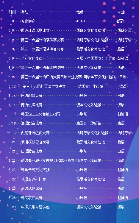 “展语言之美 树文化自信”beat365在线唯一官网第四届多语种文化艺术节将于西区五号楼广场开展,本次艺术节各专业活动具体位置如下: