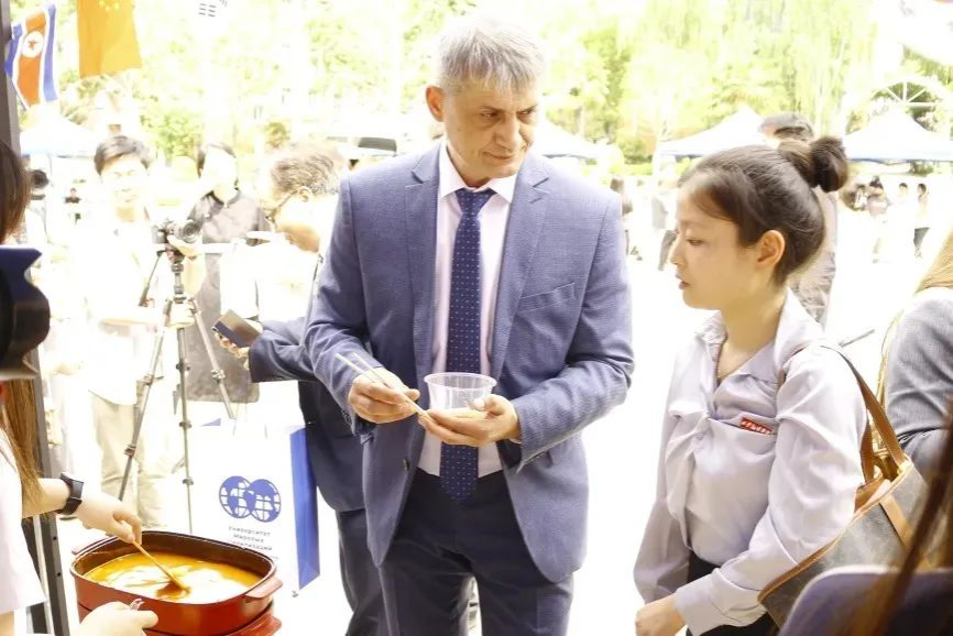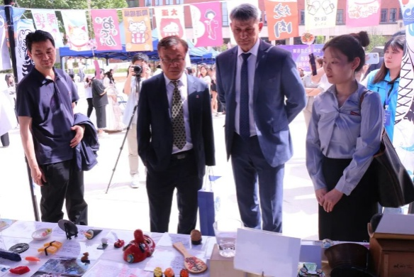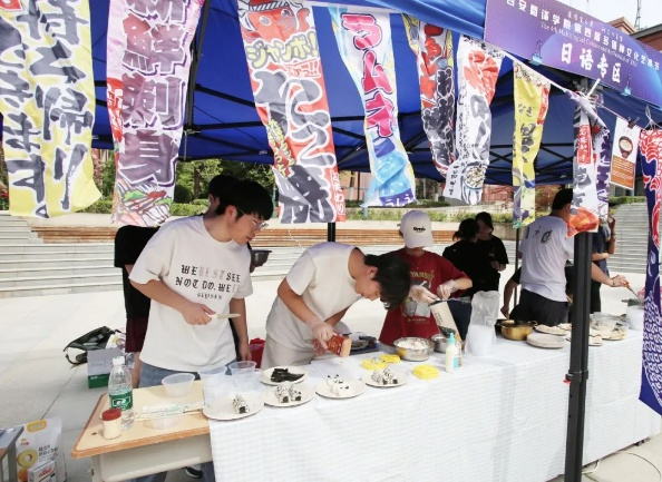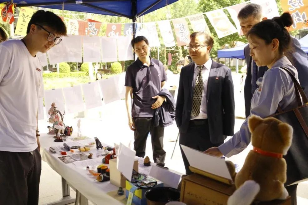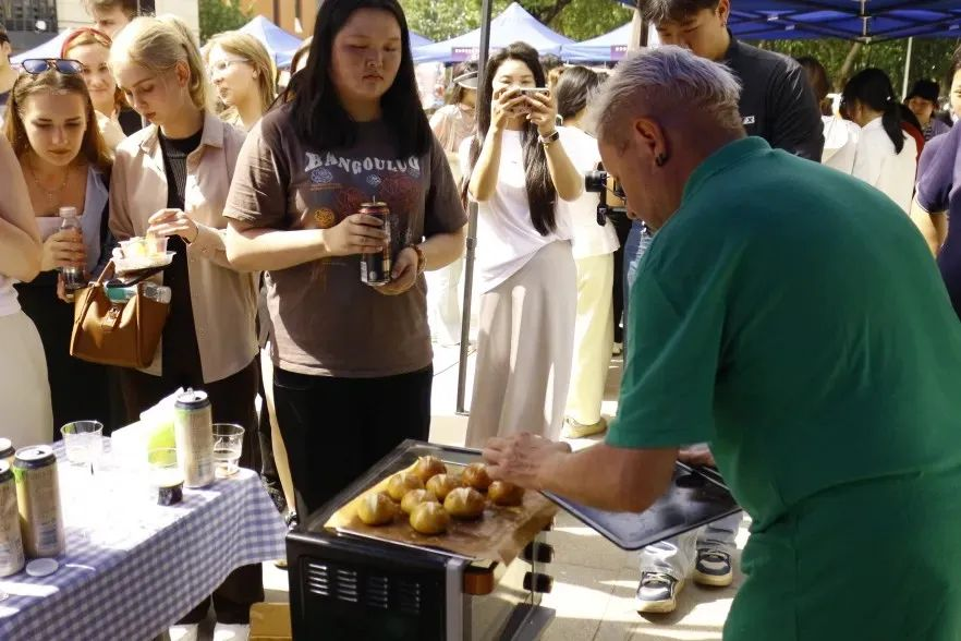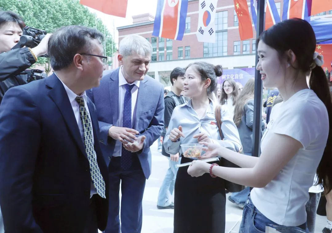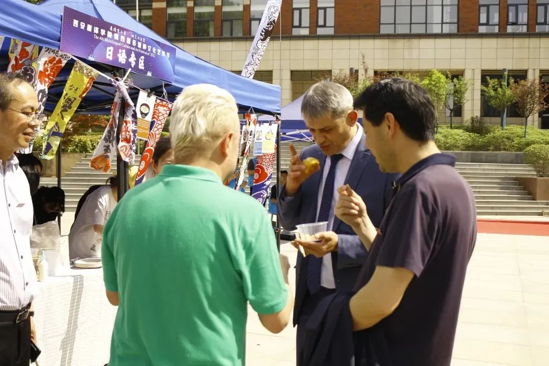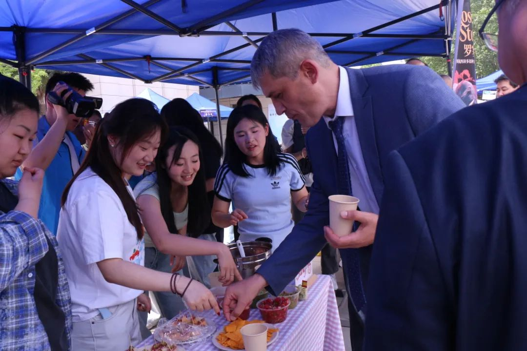 活动来到室外文化体验区,领导们品尝由学生亲手制作的各国特色美食。从精致的日式和果子、到香气四溢的卷饼,碱水面包。每一道美食都承载着不同国家的饮食文化,展现出学生们对各国文化的深入理解与实践成果。室外场所还设置了多语种展示、传统技艺体验等多个展区,丰富的活动内容吸引了众多师生驻足参与,现场学术氛围与文化气息交融,充分彰显了beat365在线唯一官网在推动多语种教育与文化交流方面的积极探索与卓越成效。