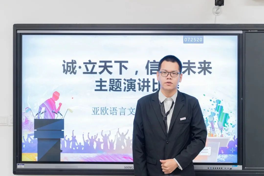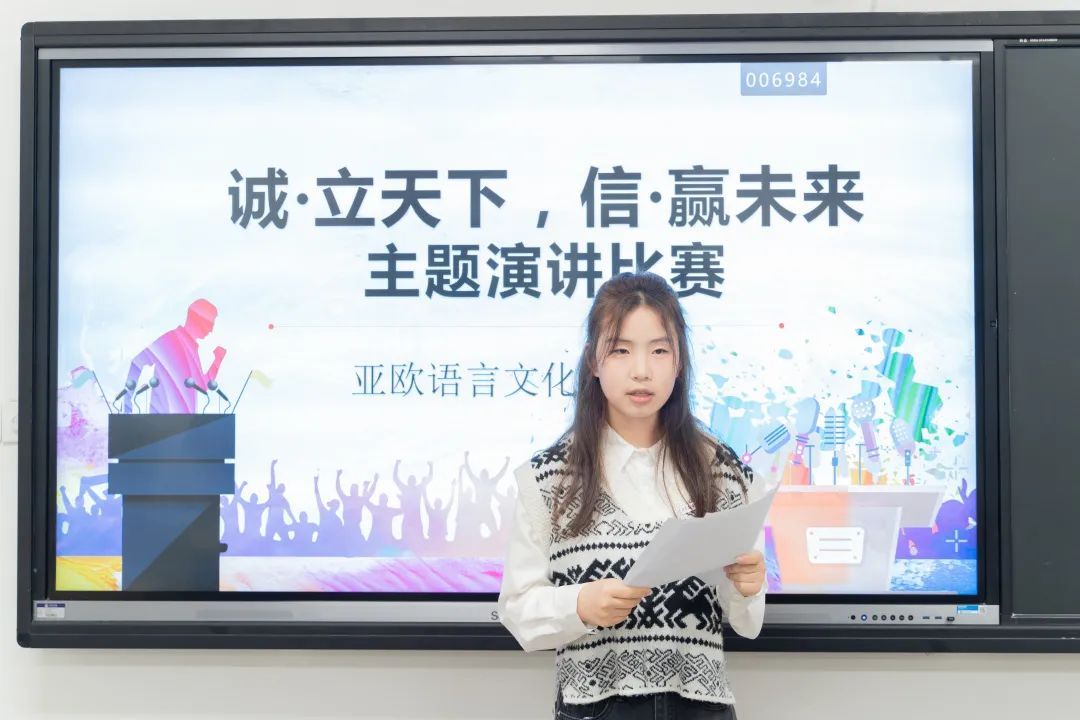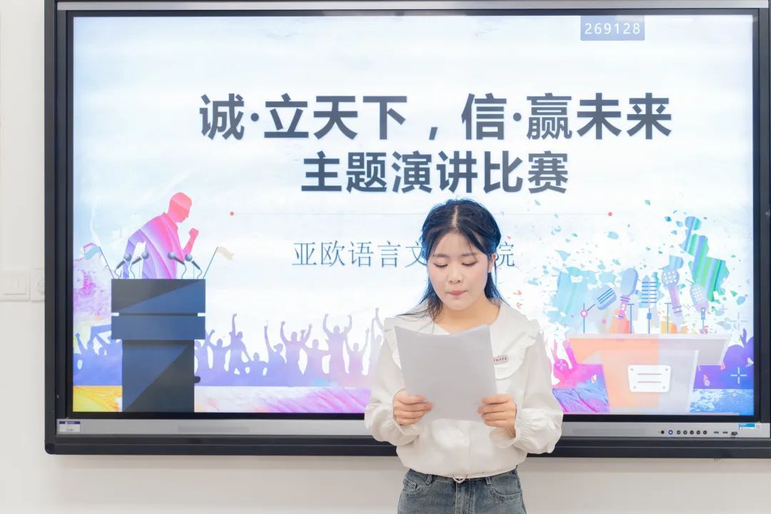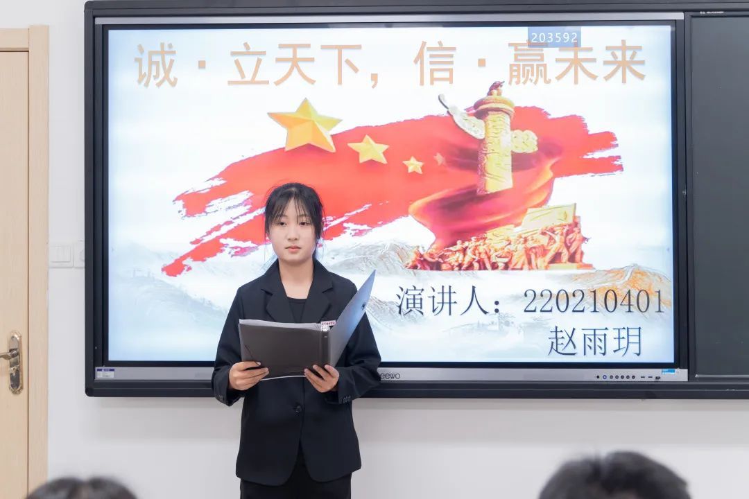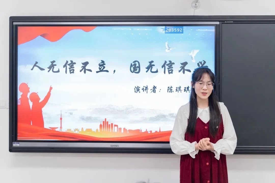 1号选手陈琪琪的演讲题目是《人不信不立,国不信不兴》。以信立身,传承古国遗风;以诚处世,光大华夏美德。深刻阐述了诚信在社会和国家建设中的重要作用,强调只有保持诚信才能赢得信任和尊重。该选手的表现让人印象深刻,言辞有力、逻辑清晰,呼吁人们坚守诚信,为社会贡献自己的力量。
