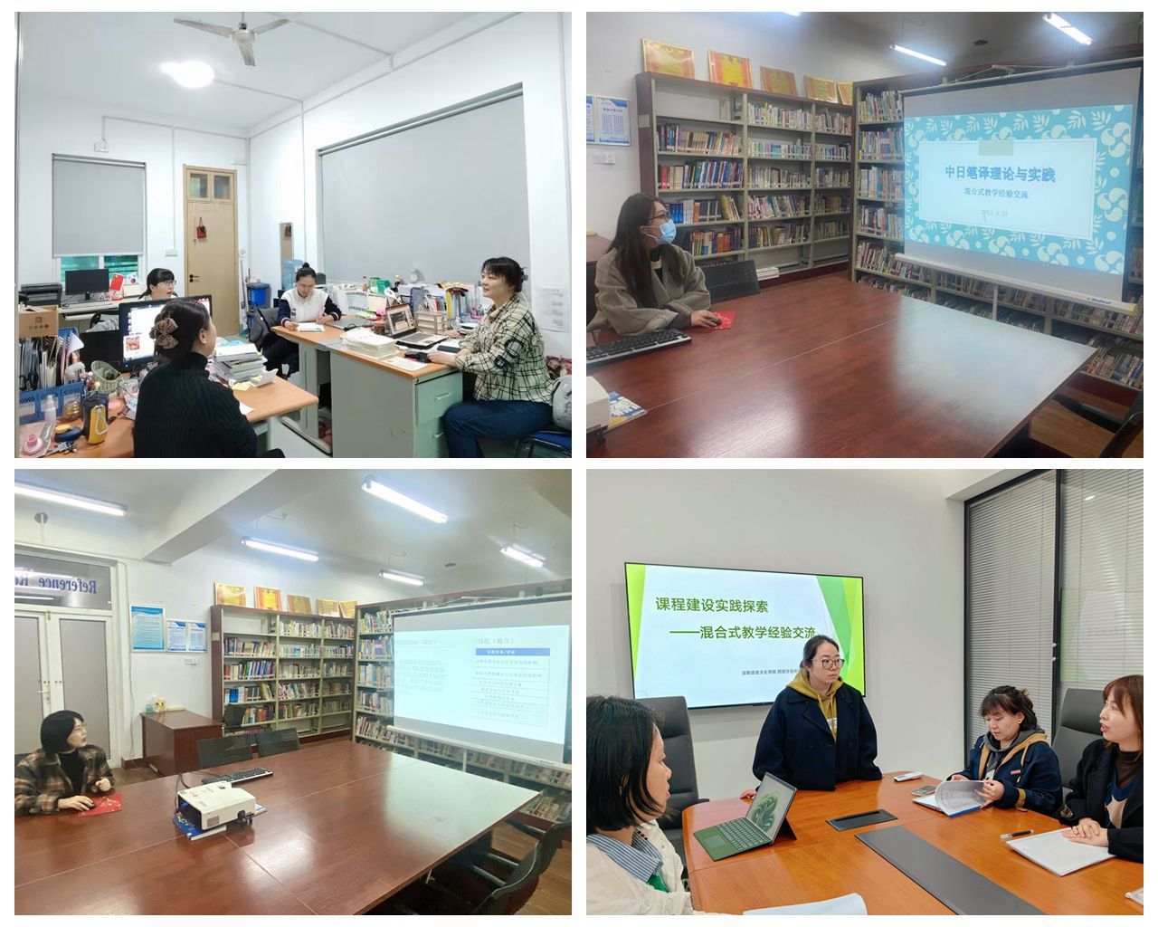 会上,法语系主任王姗姗、日语专业教师齐娜、刘烨和朝鲜语专业教师秦广兰结合自身专业课程,对混合式课程建设、教学经验、存在问题以及改进建议进行汇报和分享。