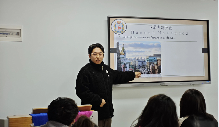 下诺夫哥罗德国立库兹马·米宁师范大学交换生陈家毅主要介绍了下诺夫哥罗德这座城市。他表示,这座城市具有极其丰富的历史底蕴,这里诞生了很多俄罗斯民族英雄:带领俄国人民击败侵略者的库兹马·米宁,甚至在中国都家喻户晓的马克西姆·高尔基和在伟大卫国战争中牺牲的苏联红军飞行员瓦列里·契卡耶夫。他还介绍了下诺夫哥罗德的永恒之火、美丽的街道、以及瓦列里·契卡耶夫和弗拉基米尔·列宁的纪念碑。