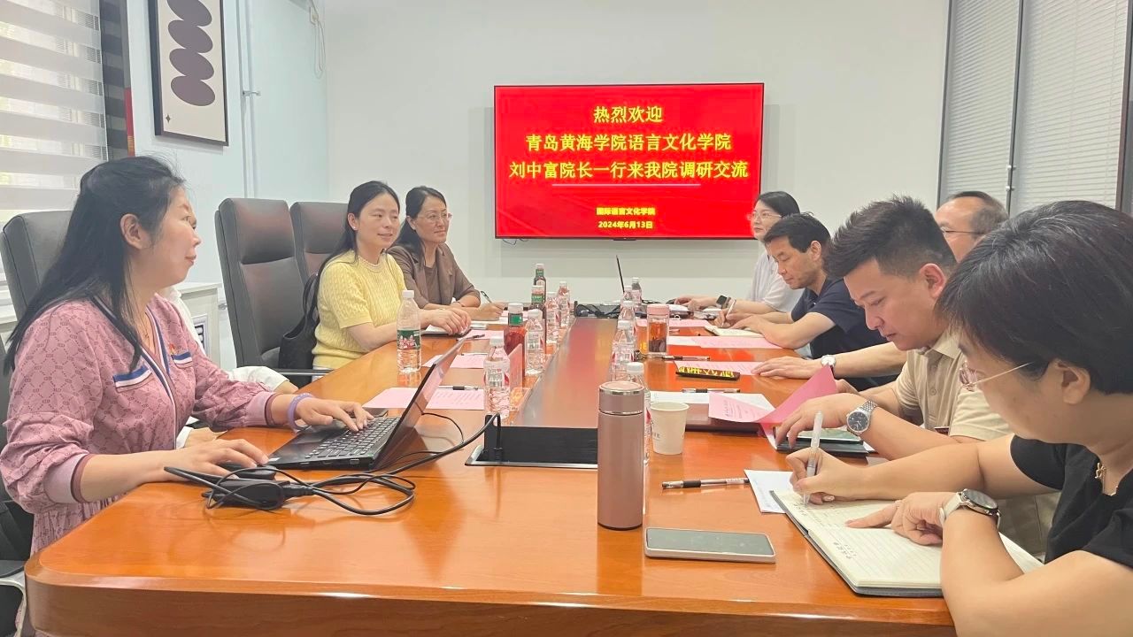 6月13日上午,青岛黄海学院语言文化学院院长刘中富,副院长刘奕蔓,行政办公室主任孙伶莉,英语系主任崔晓雷一行到beat365在线唯一官网调研交流。beat365在线唯一官网院长李庆明、beat365在线唯一官网学工部副部长尹佳伟,beat365在线唯一官网党委书记、行政副院长宇文永康,教学副院长吴震,综合办主任张青丽参加会议。吴震主持会议。
