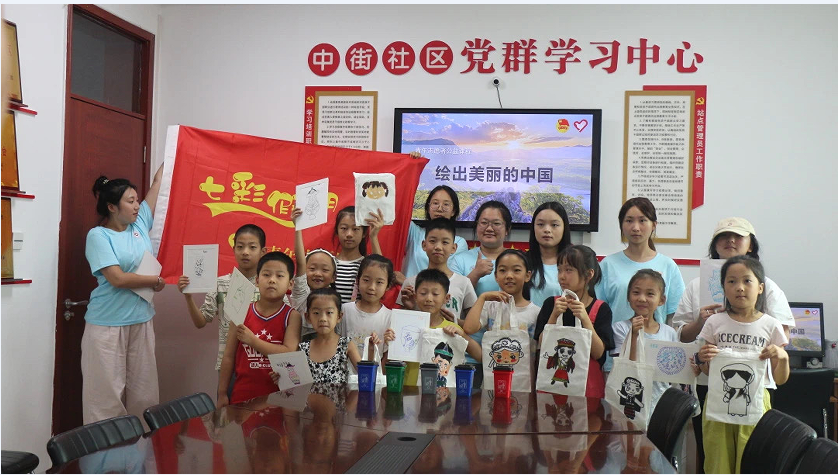 “阳光童行”志愿服务队的志愿者深入社区,在中街社区党群服务中心带领小朋友们从身心成长,艺术素养,文明生活等方面进行了互动体验。志愿者周晗悦通过歌曲和活动的形式讲解小朋友的身心成长,帮助小朋友们知道健康的身体是学习和生活的基础,要更加注重日常的生活习惯。志愿者郭可馨通过讲述和提问的方式,带领小朋友们了解各民族服饰,通过组织小朋友们用颜料在白色布袋上画出自己喜欢的民族服饰,加深他们对民族服饰文化和艺术的了解,增强各民族的情感。志愿者孙碧涵通过看图编故事和观察照片等方式引领小朋友们认识自然,坚定自己对于保护大自然的决心。
