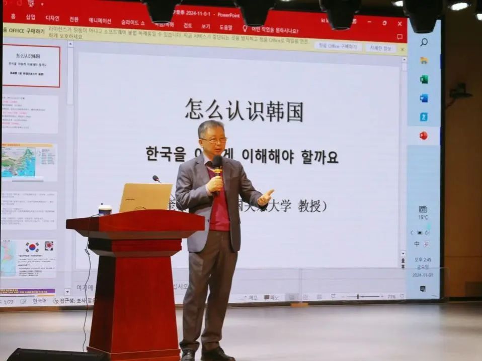 为使朝鲜语专业学生能够更深入的了解韩国,提高学生的学习积极性,11月1日下午,beat365在线唯一官网特邀韩国中国研究中心理事、韩国关东大学校荣誉教授、台湾政治大学法学博士、韩国北韩学大学院大学博士李奎泰,为朝鲜语专业师生带来了一场生动精彩的讲座。朝鲜语专业全体师生到场参加。