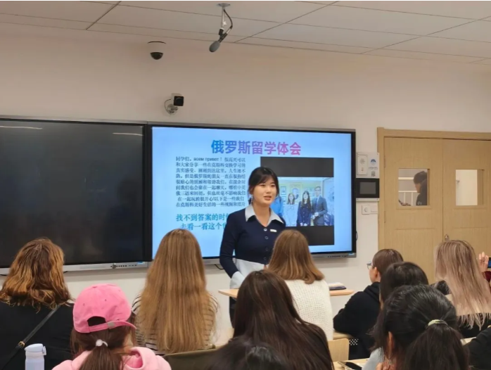 同时,俄语专业邀请了部分俄罗斯留学生参会。俄罗斯留学生向2024级新生介绍了自己俄罗斯的母校,他们表示,中俄两国友谊深厚,欢迎同学们以后到俄罗斯学习。现场气氛热烈,同学们反响良好。