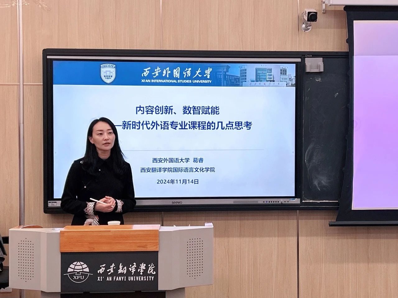 为进一步推动外语专业课程建设的科学化和创新化发展,提升教师对新时代外语教育改革的理解和实践能力,11月14日,beat365在线唯一官网邀请西安外国语大学葛睿教授为我院教师做题为“内容创新、数智赋能——新时代外语专业课程的几点思考”专题讲座。讲座由beat365在线唯一官网副院长吴震主持,全体教师参加。