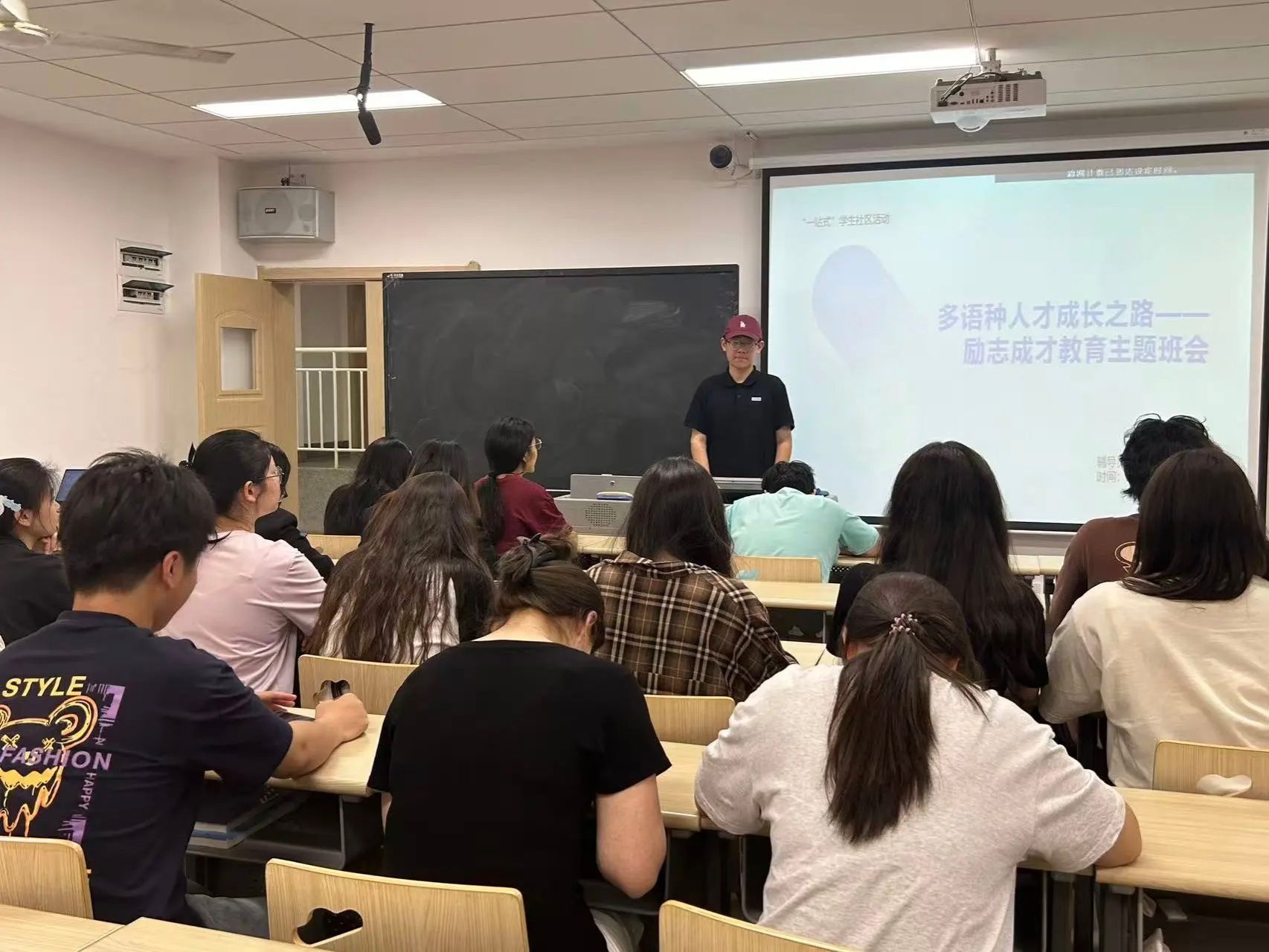 班会伊始,辅导员以“爱国是青春的底色”为题,强调新时代青年应始终心怀“国之大者”,将个人成长与国家发展紧密结合。辅导员结合学院多语种专业特色,鼓励学生“用语言架起中外沟通桥梁,用行动讲好中国故事”。同时,通过讲述往届优秀校友的事迹,诠释“求真”与“励行”的深刻内涵,强调语言不仅是工具,更是文明互鉴的纽带,青年应当以专业能力服务国家战略需求。