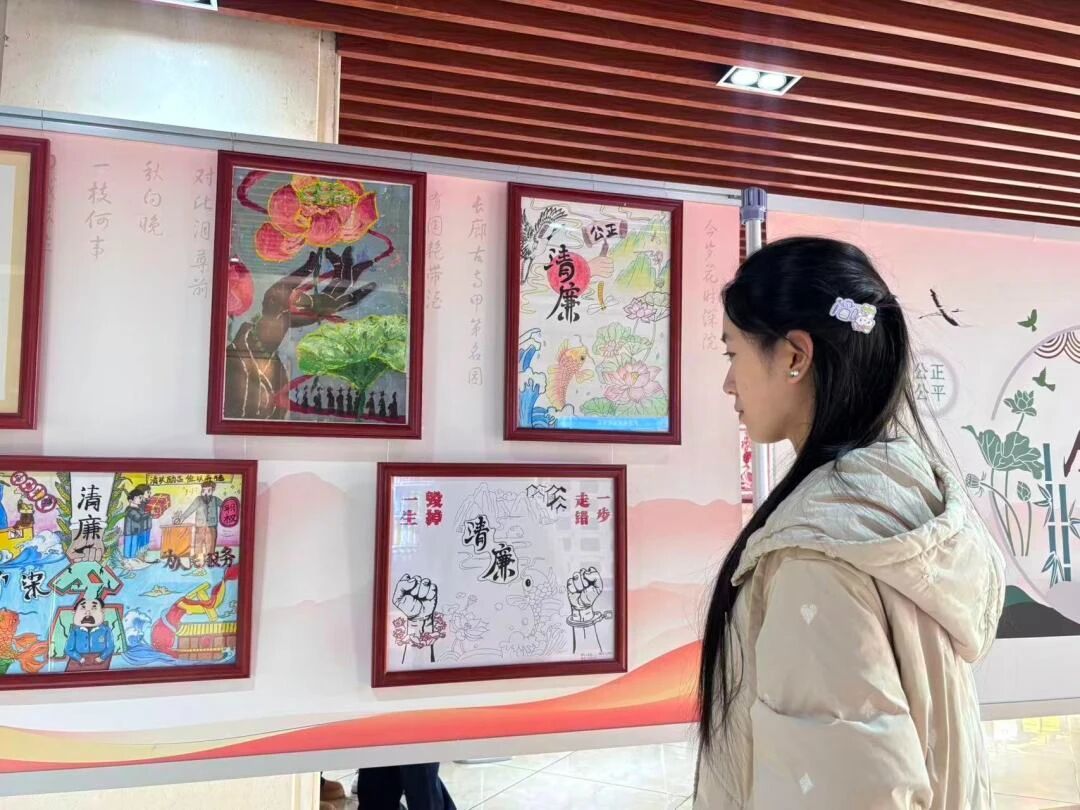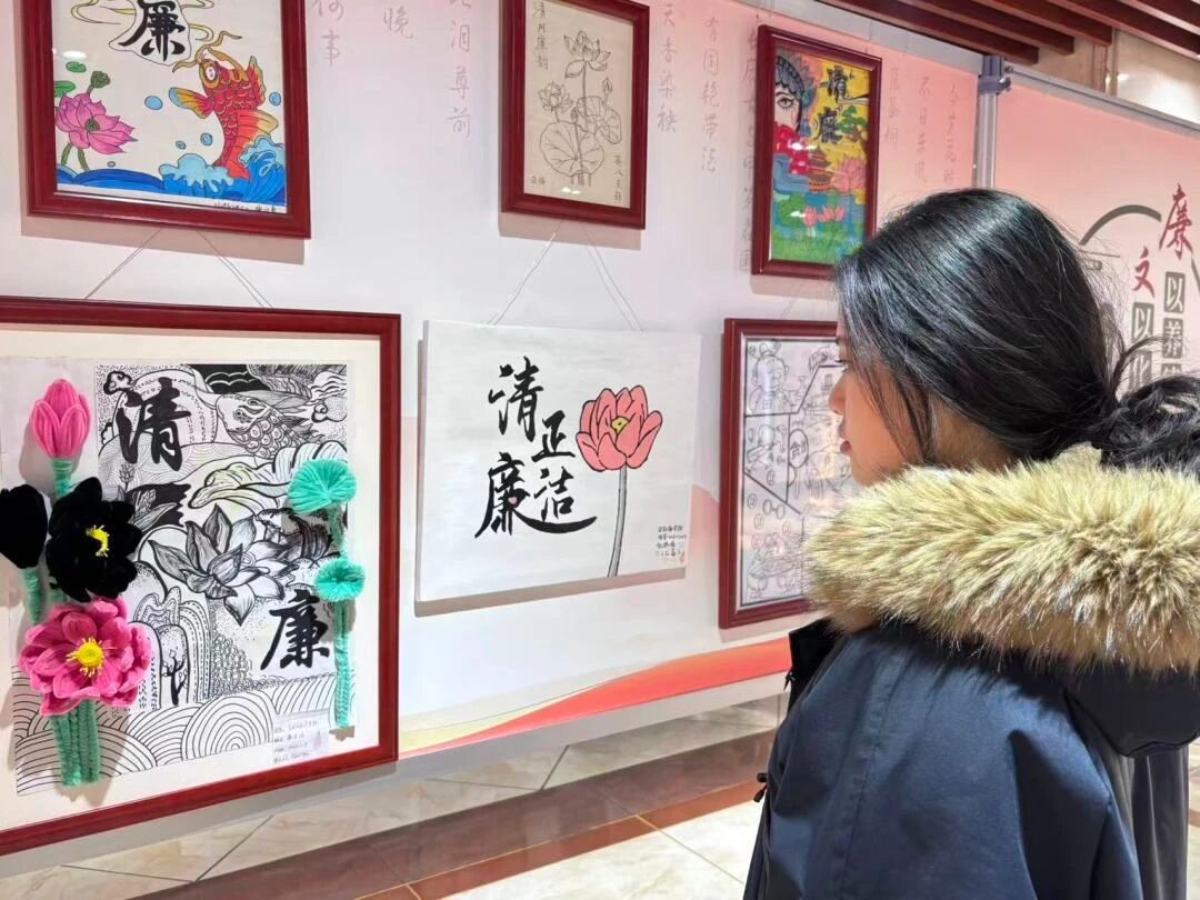 展览汇集了主题鲜明、形式多样、寓意深刻的书画作品,通过艺术语言生动诠释廉政内涵,弘扬清风正气。当天下午,在beat365在线唯一官网第二党支部书记李潇琦的组织下,学生党员和入党培养对象们有序进入展区,认真观摩学习。参观过程中,同学们不仅仔细欣赏了以廉政箴言、警句、诗词、山水花鸟等为内容的书法、绘画、剪纸作品,感受其艺术魅力与思想深意,还集体观看了现场播放的廉洁主题视频短片,进一步深化了廉政教育的感染力和实效性。展览将艺术欣赏、思想教育与价值引导有机结合,为同学们上了一堂生动而深刻的廉政文化课。